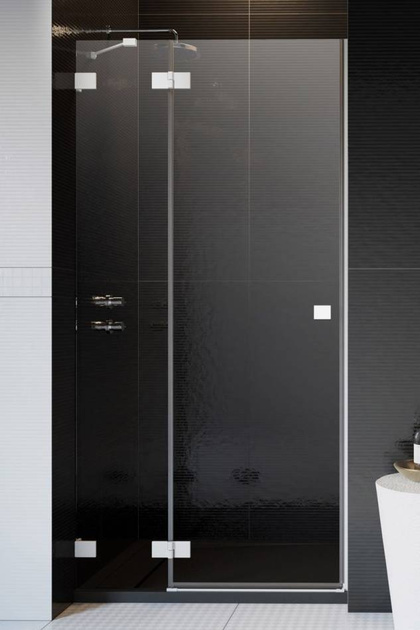 Drzwi prysznicowe 100 cm wnękowe z białymi zawiasami i klamrami z serii Radaway Essenza Pro White DWJ z zawiasami po lewej stronie.